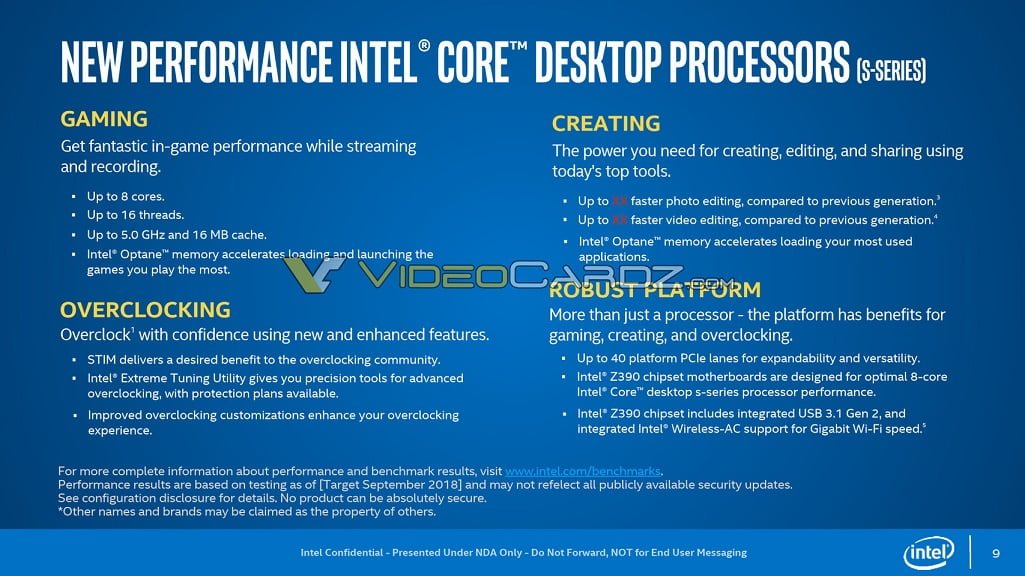 شرکت Intel به تازگی اسلاید هایی را منتشر کرده است که در آنها به برخی موارد ناگفته از چیپست Z390 پرداخته و همچنین تائید کرده است که CPUهای نسل نهم آن در زیر سطح IHS خود حامل لحیم خواهند بود. هر چند که در این صورت باز کردن سطح IHS برای اورکلاکرها مقداری دشوار و خطرناک خواهد شد، اما برای عموم کاربران یک مزیت به حساب آمده و همچنین طول عمر CPU را نیز افزایش خواهد داد.