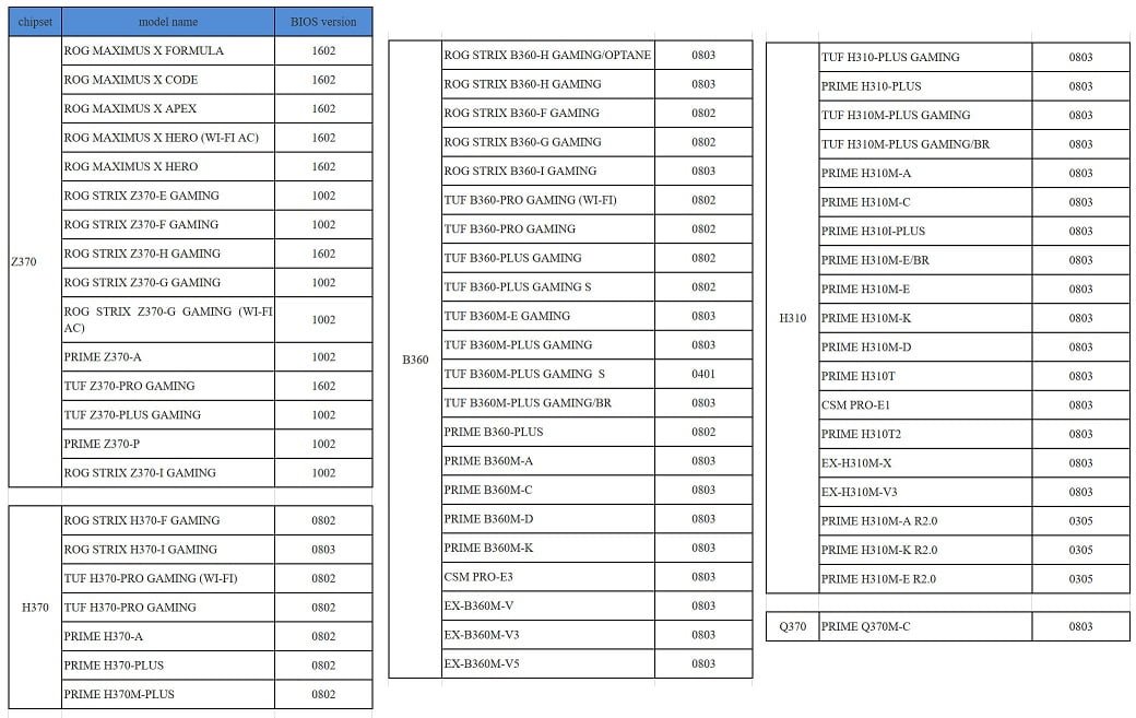ایسوس اعلام کرده است که طیف عظیمی از مادربردهای این شرکت مبتنی بر چیپست های H310, B360, Q370 و H370 هستند، امکان پشتیبانی از CPUهای جدید نظیر Core i9-9900K، Core i7-9700K و Core i5-9600K را دریافت خواهند کرد.
