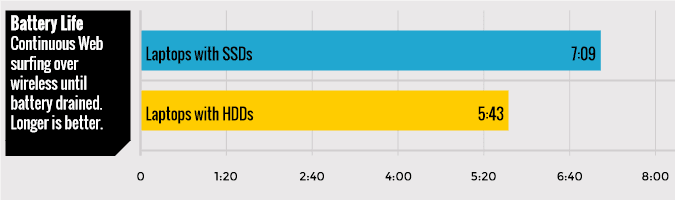 کاهش مصرف جریان=کاهش دما.کاهش دما نیز برابر با کاهش آمار خرابی و عمر بالای باتری است.در نتیجه یکی از بزرگترین مزایای استفاده از SSD در لپ تاپ ها،کاهش مصرف جریان و دمای تولید شده است.به عنوان مثال سری می زنیم به نتایج تست یک لپ تاپ Dell Inspiron 15 5000 در حالت استفاده از SSD و HDD.این لپ تاپ به 8 گیگابایت حافظه رم،یک هارد دیسک 5400 دور در دقیقه و یک پردازنده Core i5 مجهز شده است.درایو سالید مورد نظر نیز دارای 256 گیگابایت حجم است.تصویر پایین به مدت زمان کارکرد باتری لپ تاپ با HDD و SSD را نشان می دهد.به همراه SSD مدت نگهداری از باتری 7 ساعت و 9 دقیقه و در زمان استفاده از HDD مدت زمان به 5 ساعت و 43 دقیقه کاهش یافته است.