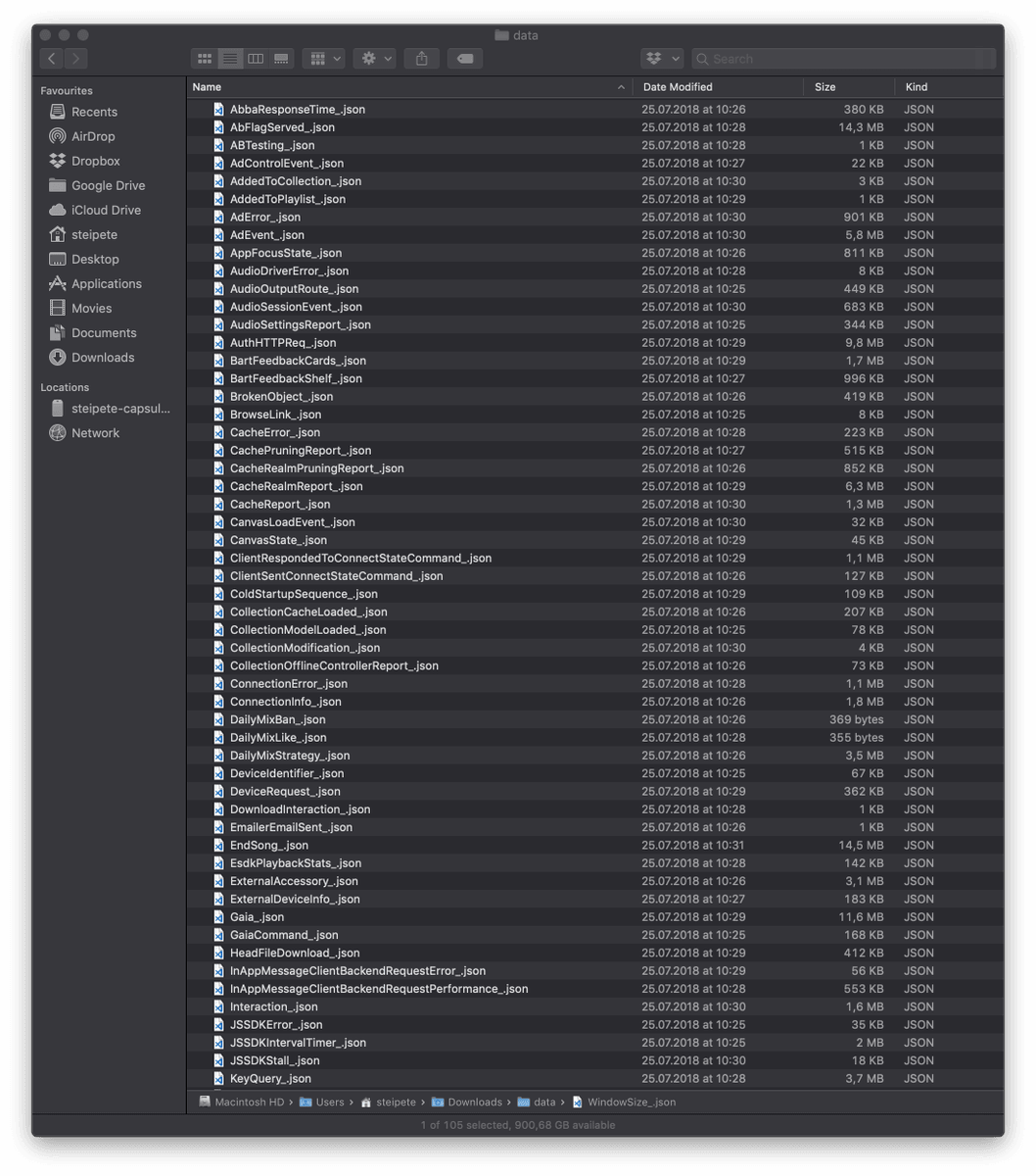 این کاربر که پیتر اشتاینبرگر نام دارد روز گذشته در حساب کاربری خود در توییتر نوشت با توجه به حق قانونی خود از طریق GDPR از اسپاتیفای درخواست کرده تا اطلاعاتی که از او جمع آوری شده است را در اختیار وی قرار دهد. ابتدا 6 فایل JSON توسط تیم فنی اسپاتیفای برای وی ارسال شده که تقریبا هیچ نکته قابل ملاحظه ای را در بر نداشته است. پس از آن به مدت یک ماه پیگیری های او ادامه داشته تا در نهایت آرشیوی با حجم 250 مگابایت از طرف اسپاتیفای در اختیار وی قرار داده شده که شامل تمامی برهمکنش های وی در این سرویس است. از جمله می توان به لایک کردن آهنگ ها، ارسال پیام، گوش دادن به یک موسیقی خاص، اضافه کردن آهنگ خاصی از پلی لیست یا حتی مراجعه به پلی لیست های سایر کاربران و جست و جوهای انجام شده توسط وی اشاره کرد. اما نکته ای که بیش از هر چیز قابل توجه است ذخیره شدن برند هدفون و هدست هایی است که او در هنگام گوش کردن به موسیقی از طریق اسپاتیفای از آنها استفاده کرده! چنین کاری بدون دسترسی و کاوش عمیق فایل هایی مانند CoreBluetooth امکان پذیر نیست.