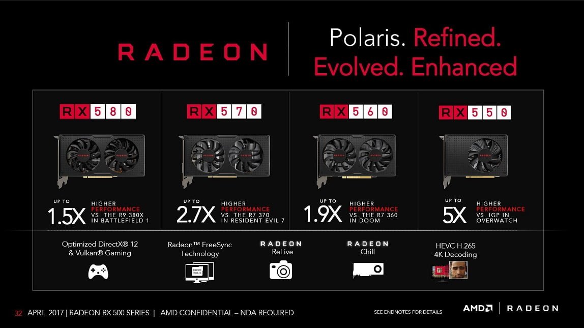 شرکت AMD امروز اطلاعات بیشتری را در زمینه کارت گرافیک های جدید خود منتشر کرده است. کارت گرافیک های Radeon RX 500 series به واقع Rebrand های RX400 هستند. اصطلاحاتی بر روی معماری ستاره قطبی انجام گرفته است که AMD بدان ها نیز اشاره کرده است. از جمله این موارد می توان به اصلاحات در سطح تولید لیتوگرافی FinFET 14nm، افزایش سرعت فرکانس هسته، استفاده از توان کمتر در حالت idle و ویژگی های نرم افزاری جدید. با این وجود برخی از تولید کنندگان سخت افزار این محصولات را بدون تغییر چندانی تولید و آماده ورود به بازار کرده اند. کارت گرافیک Radeon RX 550 با قیمت 80 دلار به عنوان ارزان ترین SKU شناخته می شود. کارت گرافیک Radeon RX 560 با قیمت 120 دلار، کارت گرافیک RX 570 با قیمت 169 دلار و در نهایت کارت گرافیک RX580 در پیکربندی 4 گیگابایتی خود با قیمت 200 دلار و در نسخه 8 گیگابایتی با قیمت 229 دلار راهی بازارهای جهانی خواهند شد.