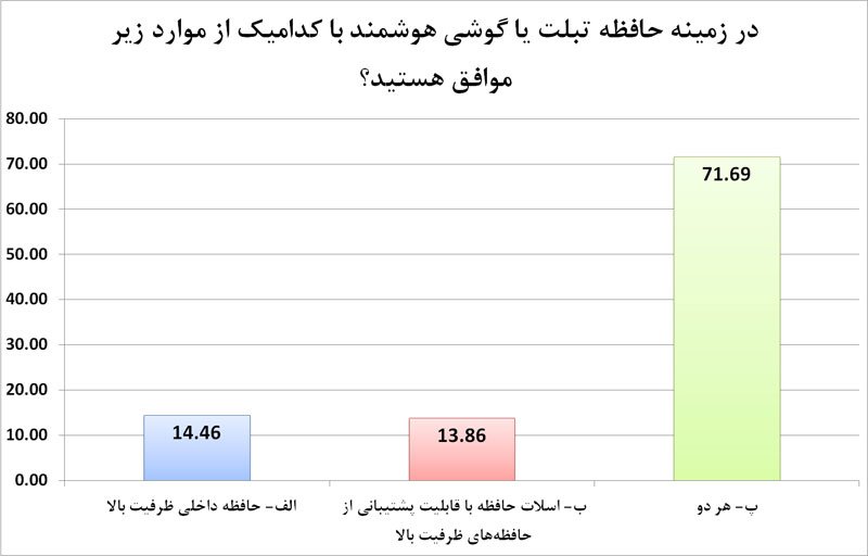 از اين نمودار يک نتيجه خوب ميتوان گرفت که مردم بيش از همه موارد به حجم حافظه اهميت ميدهند تا به نوع قابل جدا کردن يا غيرقابل جدا کردن آن يعني دوست دارند هر دو حالت را داشته باشند تا فقط حجم حافظهاي موبايل يا تبلت آنها افزايش يابد.