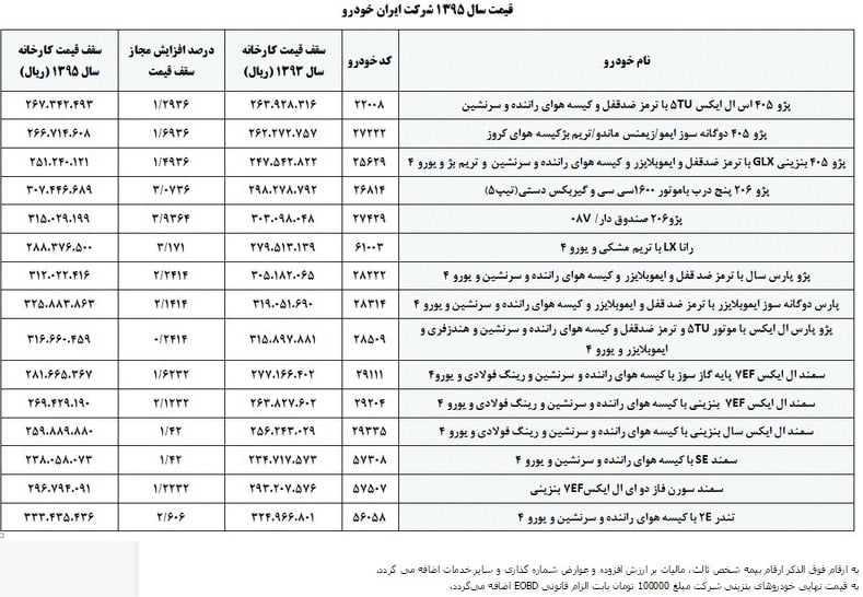 نکته قابل توجه آنکه در خبرهای منتشر شده در رسانه ها اعلام شده است که “ضرایب افزایش مجاز سقف قیمتی متوسط افزایش سقف قیمت در سال 1395 برابر با 1.5 درصد است”. معنی این جمله پیچیده آن است که خبری از افزایش 1.5 درصدی قیمت ها نیست و همان طور که اشاره شد برخی خودرو ها می توانند تا 4 درصد هم با افزایش قیمت روبرو شوند. البته باید به این لیست، افزایش 15 درصدی نرخ حق بیمه شخص ثالث اجباری، مالیات، هزینه های شماره گذاری و افزایش هزینه های جانبی را هم افزود تا در نهایت متوجه شویم به احتمال زیاد خودروها در سال 95 چیزی بین 2 تا 5 میلیون تومان افزایش قیمت خواهند داشت.