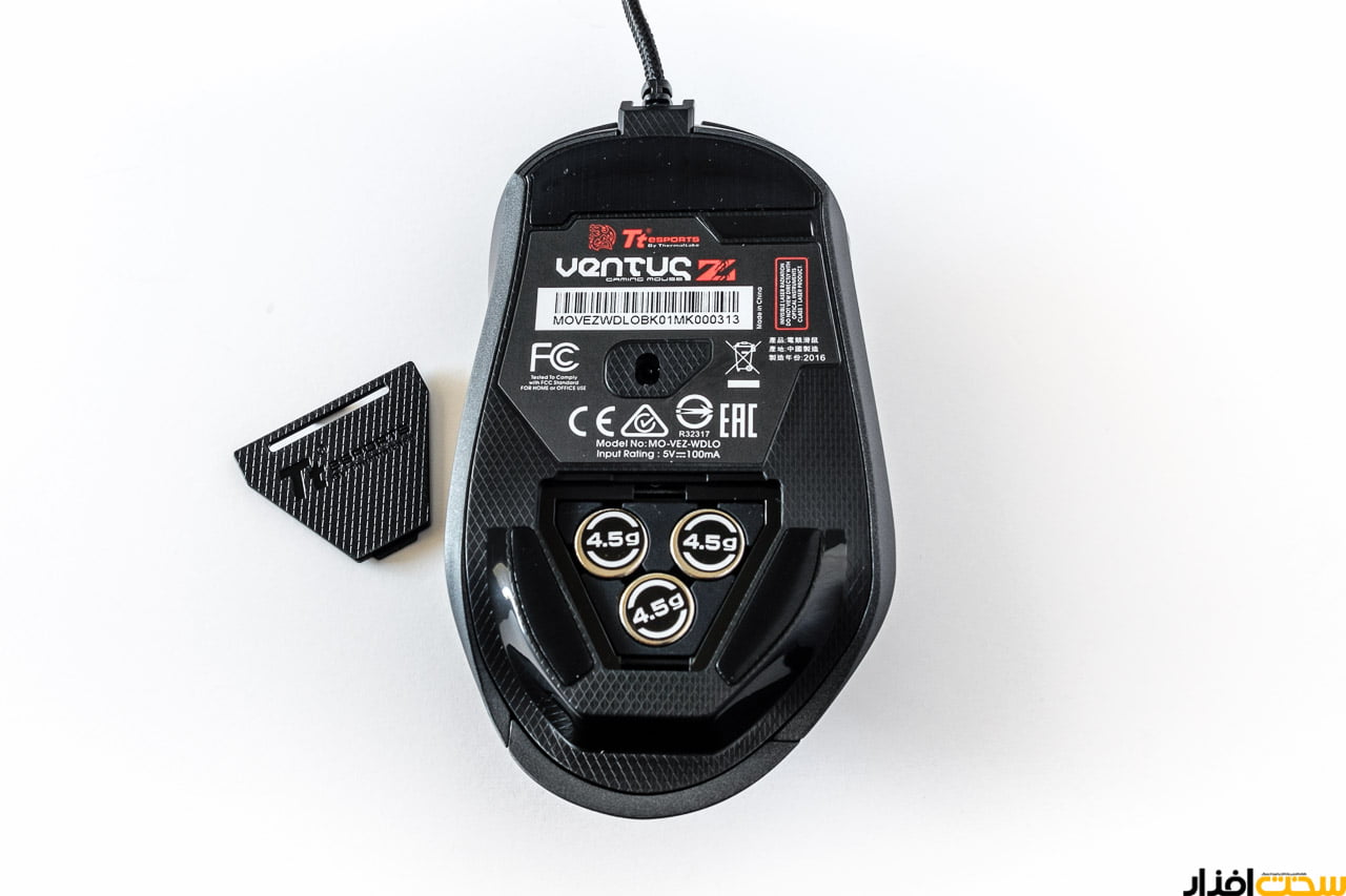 نشان سری Tt eSports نیز در زیر این بخش قرار داشته و با LED های رنگی شکل جذاب تری به این ماوس داده است. در عمل باید گفت که روکش مات و ضد تعرق نسبتا مناسب بوده (کارایی مشابه با دیگر نمونه های موجود در بازار)، اما شیار های و سوراخ های در نظر گرفته شده را می توان یک راهکار فانتزی دانست که شاید در عمل آنطور که انتظار دارید نباشند. زیرا وقتی دسستان را روی ماوس گذاشته اید، تقریبا شیار های کناری که برای عبور هوا تعبیه شده اند را نیز میپوشانید و در عمل فضای زیادی برای عبور هوا وجود نخواهد داشت!