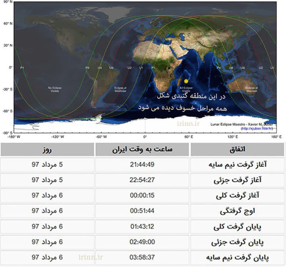 ماه گرفتگی پنجم مرداد از نوع “گرفت کامل” خواهد بود و علاوه بر ایران و خاورمیانه، برخی از مناطق آمریکای جنوبی، اروپا، آفریقا و استرالیا نیز می توانند بخش هایی از این ماه گرفتگی را مشاهده کنند. بر اساس اطلاعات نجومی موجود از ابتدای قرن بیست و یکم تا به حال 17 ماه گرفتگی کامل بر روی زمین مشاهده شده که تا پایان این قرن به 85 عدد خواهد رسید. از طرفی به گفته مدیر انجمن نجوم آماتوری ایران این ماه گرفتگی با مدت 103 دقیقه طولانی ترین ماه گرفتگی قرن خواهد بود. البته در سال 1408 هم یک ماه گرفتگی طولانی دیگر به مدت 102 دقیقه رخ خواهد داد که به دلیل غروب ماه در آسمان این بخش از کره زمین در ایران قابل مشاهده نخواهد بود. آن طور که منابع علمی بین المللی اعلام کرده اند، آغاز گرفت نیم سایه در ماه گرفتگی امشب از ساعت 21:44 به وقت ایران خواهد بود و گرفت جزئی از 22:54 دقیقه اتفاق می افتد. سپس در ساعت 00:00 (دقیقا 12 نیمه شب یا صفر بامداد) گرفتگی کلی آغاز می شود و در ساعت 00:51 (پنجاه و یک دقیقه بامداد) به اوج خود می رسد. پایان گرفتگی کلی نیز ساعت 1:43 دقیقه شب خواهد بود و به تدریج، تا ساعت 2:49 گرفت جزئی نیز به پایان می رسد و در نهایت در ساعت 3:58 بزرگترین ماه گرفتگی قرن بیست و یکم پایان می یابد.