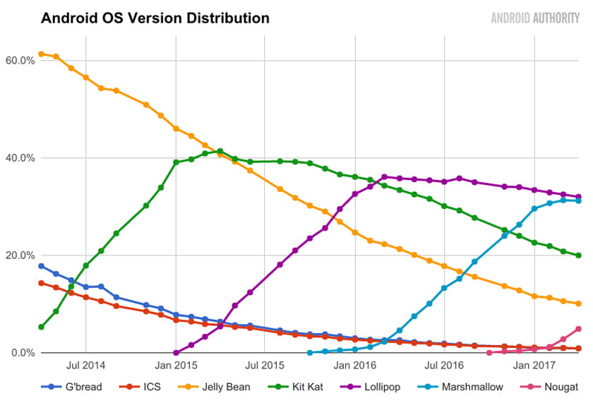 سهم دو نسخه ی اندروید نان زنجبیلی و ساندویچ بستنی نیز اکنون به زیر 1 درصد کاهش پیدا کرده است و احتمالا در ماه های بعدی این دو نسخه در جدول توزیع نسخه های مختلف اندروید وجود نخواهند داشت. اندروید کیت کت که نیز عرضه ی آن به سال 2013 بازمیگردد 20 درصد از دستگاه های اندرویدی فعال را شامل میشود. با وجود اینکه لالی پاپ فعلا محبوب ترین نسخه ی اندروید است، سهم این نسخه از اواسط سال گذشته در حال کاهش است در حالی که اندروید مارشملو در حال طی مسیری پایدار است. بدین ترتیب بر روی 80 درصد از دستگاه های اندرویدی فعال سه نسخه ی کیت کت، لالی پاپ و مارشملو نصب شده است و میتوان از روی این اعداد و ارقام، پراکندگی نسخه های اندروید را در بین دستگاه ها به وضوح مشاهده کرد. تاکنون حرکت سودمندی از گوگل برای حل این مشکل مشاهده نکردیم هر چند کمپانی با ارائه ی بسته های امنیتی سعی در بهبود امنیت دستگاه های اندرویدی داشته است و انتظار میرود مشکل تاخیر در نشر بروزرسانی ها نیز به زودی مرتفع شود.