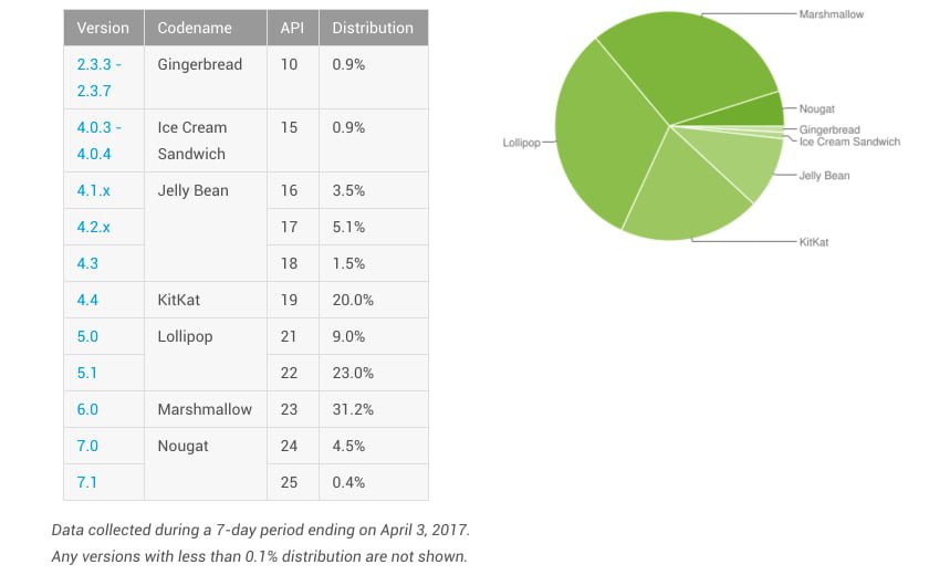 گزارش جدید گوگل مربوطه بین ماه های فوریه و مارس است و در این گزارش شاهد این هستیم که اندروید لالی پاپ همچنان بیشتر از دیگر نسخه ها در حال استفاده است و نزدیک به یک سوم دستگاه های اندرویدی فعال از این نسخه برخوردار هستند. سپس اندروید مارشملو بیش از دیگر نسخه ها در حال استفاده توسط کاربران است. سهم اندروید نوگا نیز نسبت به ماه قبل کمی افزایش یافته است و سهم این نسخه در ماه آوریل به 4.9 درصد رسیده است. از آنجا که پرچمداران مهمی من جمله جی 6 ال جی و گلکسی اس 8 و اس 8 پلاس سامسونگ به طور پیشفرض از اندروید نوگا برخوردار هستند، میتوان انتظار افزایش سهم نوگا را در ماه های آتی کشید.