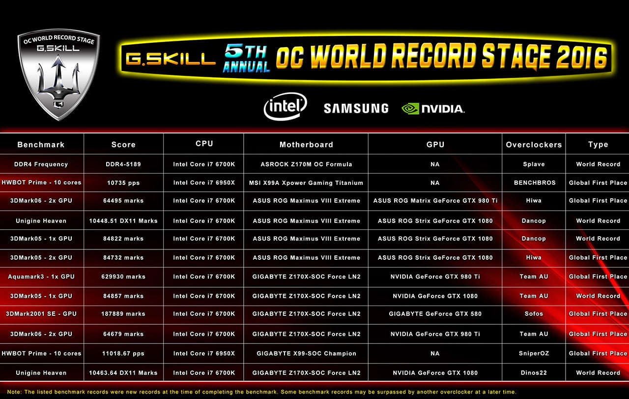 در طی این مسابقات 12 رکورد جدید در 8 رشته مختلف شکسته شد.از جمله آنها می توان به شکستن رکورد فرکانس رم های DDR4 اشاره کرد.اورکلاکرها به فرکانس موثر 5189.2 مگاهرتز در ماژول های جی اسکیل دست یافتند.جی اسکیل به طور ویژه از شرکت های سامسونگ،اینتل و انویدیا تشکر کرده و علاوه بر آن قدردان همکاری کمپانی های گیگابایت،ازراک،EVGA،MSI و دیگر مشارکت کنندگان بود.به طور عمده آخرین پردازنده های i7،حافظه های رم جی اسکیل در مدل های مختلف با سیلیکون های سامسونگ،آخرین تراشه های گرافیکی انویدیا خصوصا در خانواده پاسکال و در نهایت جدید ترین مادربردهای X99 و Z170 از جمله مهمترین سخت افزارهای شرکت کننده در این اورکلاک ها بودند.