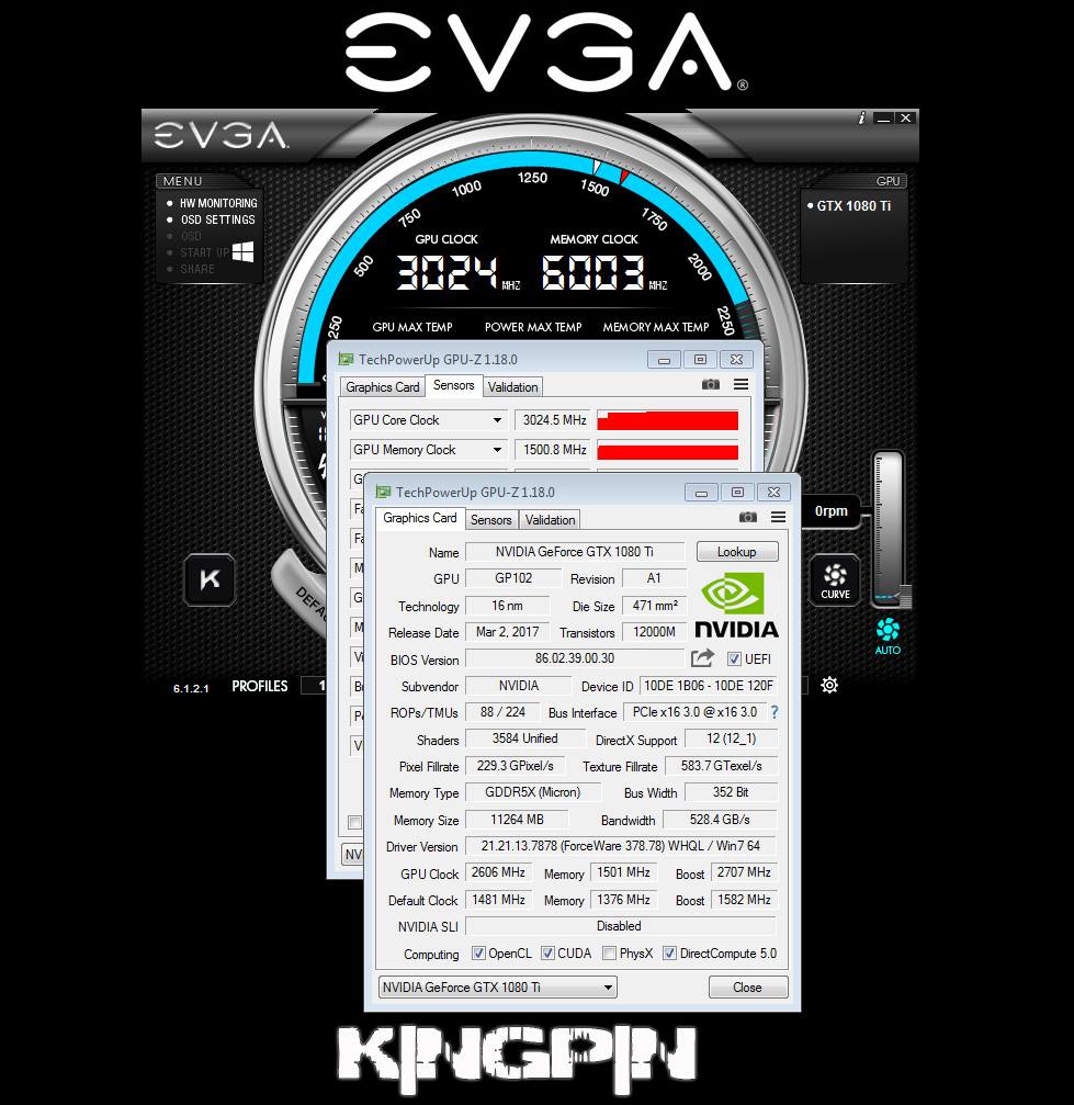 یکی از مهمترین ویژگی های کارت گرافیک GTX1080 Ti در قابلیت اورکلاک بالای آن نهفته است؛ به طوری که مدار تغذیه و فاز VRM این محصول به مراتب قدرتمند و با ثبات تر از TITAN X 2016 است. تیم اورکلاکرهای شرکت EVGA به تازگی موفق به اورکلاک جنون آمیز کارت گرافیک GTX1080 Ti شده اند. جالب است بدانید که این عملیات بر روی یک کارت گرافیک NVIDIA GeForce GTX 1080 Ti Founders Edition و نه نسخه سفارشی (Custom) صورت گرفته است. در این اورکلاک از خنک کننده های LN2 استفاده شده و کارت گرافیک مورد نظر تا فرکانس 3.0 گیگاهرتز (به طور دقیق 3024 مگاهرتز) اورکلاک شد. این کارت گرافیک تا پیش از آن نیز با قرارگیری در فرکانس 2.5 گیگاهرتز، موفق به شکستن رکورد TITAN X شده بود؛ بیشینه اورکلاک جدید که توسط EVGA ثبت شده است، بیش از دوبرابر فرکانس پایه این کارت گرافیک است!