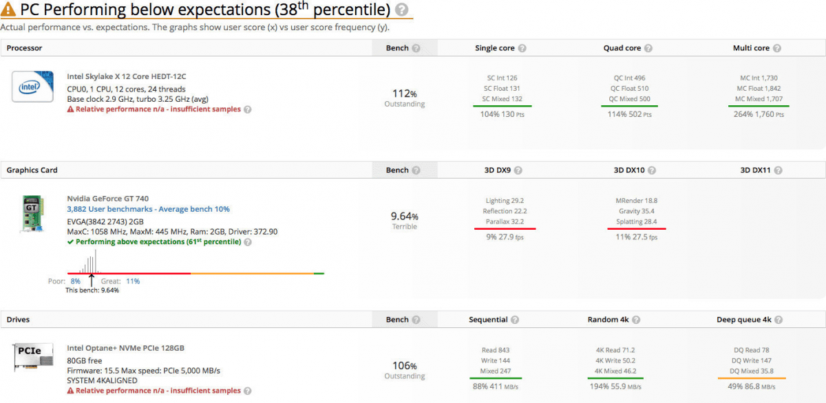 مجموعه UserBenchmark که این اطلاعات را در پایگاه داده خود وارد کرده است، اشاره ی مستقیم به نام ها نکرده و برای هر دو CPU از نامگذاری Intel BasinFalls HEDT platform (SKL-X) استفاده کرده است. پردازنده 10 هسته ای i9-7900X به امتیاز 107 در حالت تک هسته و 1467 در وضعیتی که تمام هسته ها فعال هستند، نائل آمده است. پردازنده پرچمدار و 12 هسته ای Core i9 7920X نیز امتیاز 130 در حالت تک هسته و 1760 را در حالت تمام هسته بدست آورده است.