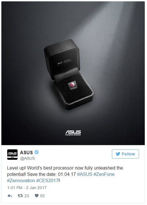 بر اساس آخرین توئیتی که در صفحه ی توئیتر ایسوس منتشر شده است، ایسوس در نمایشگاه CES 2017 گوشی هوشمند جدیدی را از سری ZenFone معرفی خواهد کرد که به چیپست اسنپدراگون 835 مجهز خواهد بود. این دستگاه در مراسم اختصاصی Zennovation ایسوس که در روز 4 ژانویه ( چهارشنبه 15 دی ماه ) برگزار میشود رسما رونمایی خواهد شد. همان طور که در تصویر توئیت ایسوس مشاهده میکنید، به طور مستقیم نامی از اسنپدراگون 835 عنوان نشده است اما با توجه به عبارت ” بهترین پردازنده ی جهان ” و تصویر لوگوی کوالکام که درون یک جعبه قرار گرفته است میتوان ایمان داشت که منظور ایسوس همان اسنپدراگون 835 بوده است.