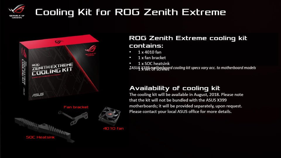 این کیت که Zenith Extreme نام دارد، برای خریداران مادربردهای مبتنی بر سوکت TR4 این شرکت نظیر ROG Zenith Extreme, ROG Strix X399-E Gaming و Prime X399-A به صورت رایگان ارائه می گردد. این کیت نه به همراه مادربرد ها، بلکه به صورت مجزا و در صورت تائید صحت خریدار، به صورت رایگان به آن داده می شود.