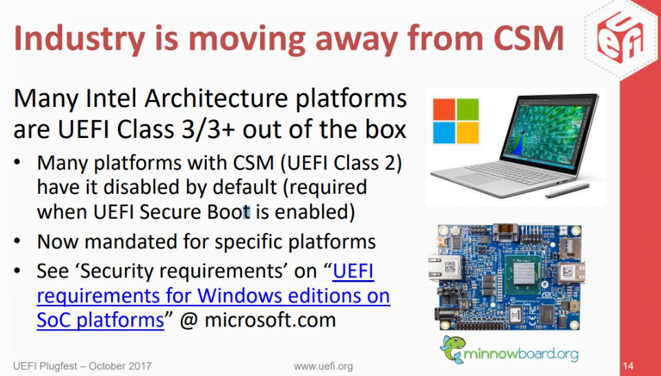 اینتل تا سال 2020 پشتیبانی از UEFI های کلاس 0، 1 و 2 را متوقف خواهد کرد و از آن زمان به بعد فقط UEFI Class 3 پشتیبانی خواهد شد. در نتیجه بوت های دوگانه برای همیشه از میان برداشته خواهند شد. CSM قابلیت های اضافی برای UEFI را فراهم می کند و از جمله این موارد بارگذاری سیستم عامل های قدیمی به وسیله یک OpROM است. هدف اینتل از قطع پشتیبانی سیستم های قدیمی در این بخش افزایش امنیت است. امروزه بسیاری از نفوذ ها به دلیل استفاده از OS و BIOS های قدیمی است که بدین ترتیب این بخش به طور کامل از میان برداشته خواهد شد. بایوس UEFI 3.0 در اوایل سال 2020 راهی دنیای سخت افزار خواهد شد.