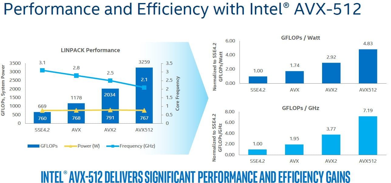 این شرکت تائید کرده است که در نسل بعدی CPU های خود، از دستورالعمل AVX-512 یا گونه 512 بیتی از Advanced Vector Extensions را به خدمت خواهد گرفت. این مسئله موجب افزایش کارایی به طور چشمگیر شده و عملکرد آنها به نسبت مدل های که از دستورالعمل AVX2 بهره می برند، نزدیک به 2 برابر در هر “وات” مصرفی افزایش خواهد یافت! این در حالی است که حتی پرفورمنس پردازنده های Cannon Lake در بخش فرکانس بر اساس “هر گیگافلاپ در ثانیه” نیز تا 2 برابر افزایش خواهد یافت.