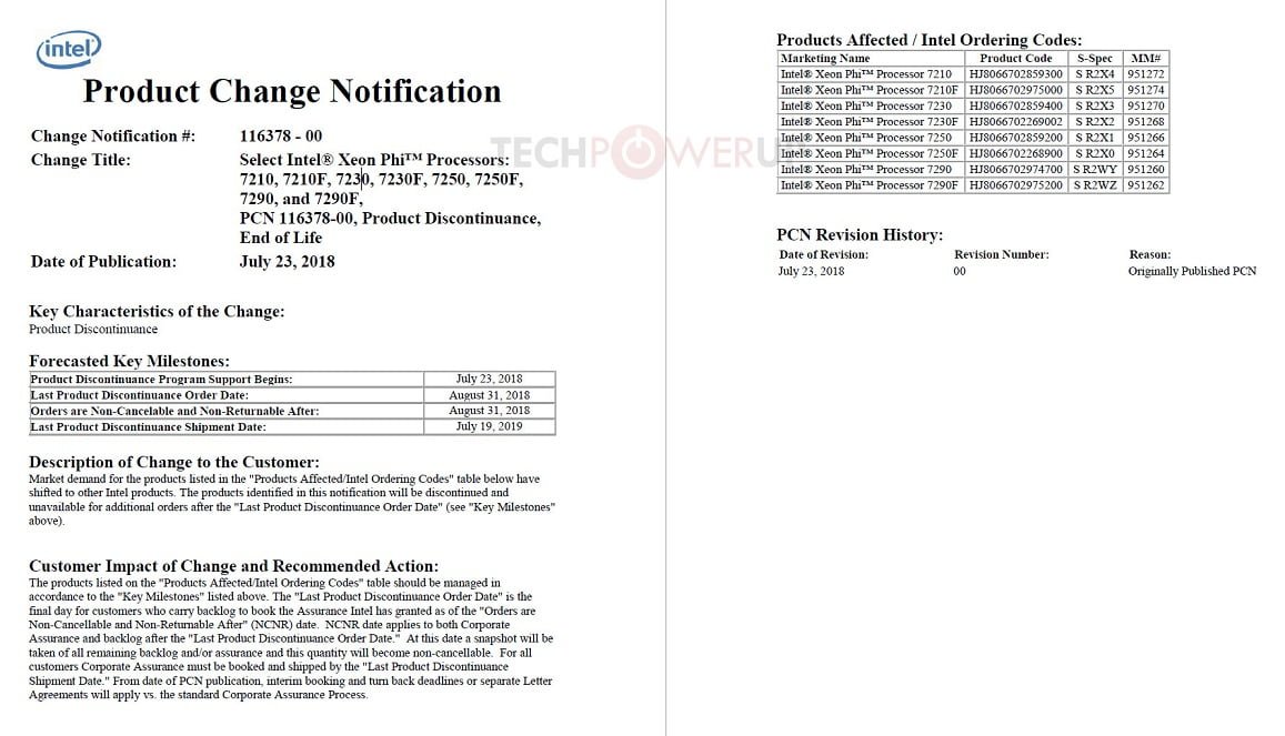 این شرکت دست کم 8 مدل از پردازنده های پیشرفته Xeon Phi را به دلیل عدم بازار مناسب و تقاضا، از گردونه تولید خارج می کند. این مدل ها عبارت اند از Xeon Phi 7210, 7210F, 7230, 7230F, 7250, 7250F, 7290 و 7290F که دیگر راهی بازار نخواهند شد. Intel قرار بود تا نسل جدید این پردازنده ها را با کد رمز Knights Hill، در لیتوگرافی 10 نانومتری به تولید برساند که تقاضای پایین این شرکت را مجبور به ترک این پروژه کرده است.