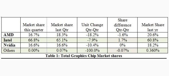 در این بین کمپانی AMD با از دست دادن سهم 18.2 درصدی نسبت به رقبای خود در مدت سه ماه ابتدایی سال 2014، بازنده بزرگ این رقابت نام گرفته است. انویدیا نیز با کاهش 10.4 درصدی میزان فروش پردازنده های گرافیکی و اینتل با کاهش 7.9 درصدی خود در مکان های دوم و سوم قرار دارند.