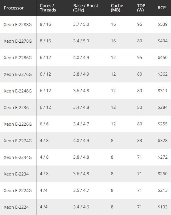 پردازندههای Xeon E-2288G و E-2278G جدیدترین مدلها هستند که به هشت هسته و 16 رشته پردازشی مجهزند که فرکانس کاری (فقط یک هسته) تا 5 گیگاهرتز قابل افزایش است. همان طور که انتظار میرفت اینتل به عرضه پردازندههای 4 و 6 هسته ای نیز که شامل مدلهای دارای Hyper-Threading و فاقد این فناوری میشوند. همانند نسل قبل، اینتل در نسل جدید نیز در اکثر مدلها از پردازنده گرافیکی UHD Graphics P630 استفاده کرده و فقط مدلهای Xeon E-2236، E2234 و E2224 هستند که فاقد گرافیک مجتمع میباشند.