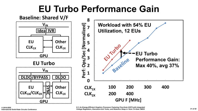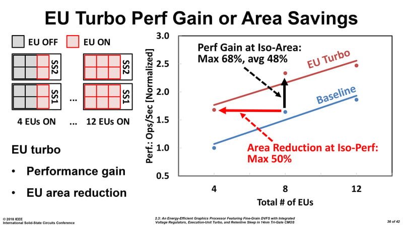 با وجود آنکه اینتل از اعلام برخی مقادیر فنی-تخصصی اجتناب کرده است، اما به خوبی نشان داده است که تنها به دنبال اثبات کارایی طراحی خود است. بدین ترتیب که 3 واحد EU در ساختار آنها استفاده شده است که هر واحد به یک کنترلر توان و کلاک متصل است؛ توان و فرکانس کاری هر یک از آنها به صورت مجزا مدیریت و تنظیم می گردد.