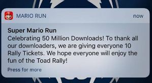 شرکت نینتندو به مناسبت 50 میلیون بار دانلود شدن باز Super Mario Run به کاربران این بازی 10 Rally Tickets به عنوان هدیه اهدا کرده است که می توان آن ها را در حالت Toad Rally استفاده نمود . نینتندو می گوید : از تمامی دانلود کنندگان بازی سوپر ماریو تشکر می کنیم و 10 Rally Tickets برای تمامی کاربران به صورت رایگان در دسترس قرار داده ایم . امیدواریم تا تمامی کاربران از حالت سرگرم کننده Toad Rally لذت ببرند .