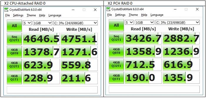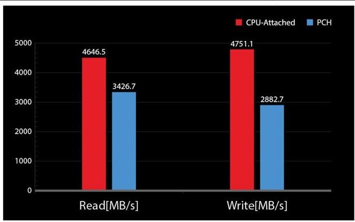 اما آرایش RAID که توسط چیپست (PCH) نیز پشتیبانی می گردد پس دلیل عرضه آپدیت بایوس جدید از سوی MSI چیست؟ پاسخ ساده است؛ آرایش RAID مجازی که از سوی CPU انجام می گیرد، به مراتب سریع تر از RAID شدن های PCH است. MSI برای این منظور اسلاید هایی را منتشر کرده است که RAID های VROC را با چیپست مقایسه کرده است.