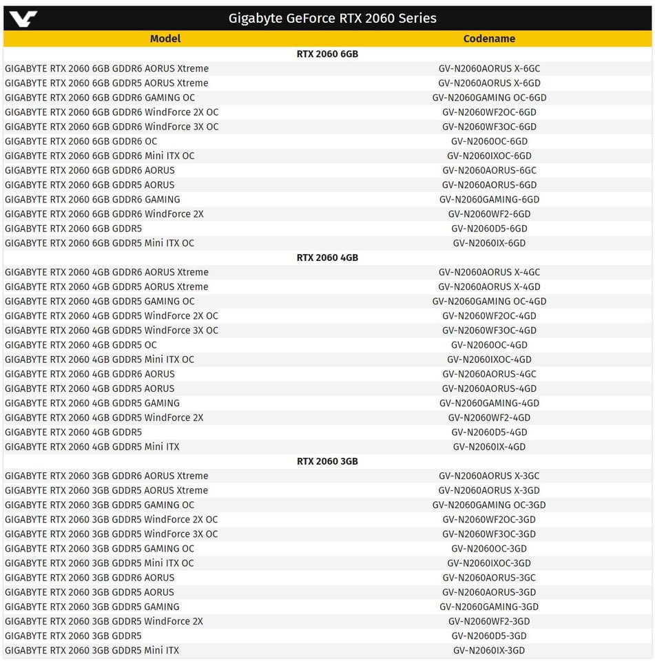 این اطلاعات که از پارت نامبرهای شرکت گیگابایت به بیرون درز کرده و احتمالا می تواند باعث سرشاخ شدن انویدیا با این کمپانی گردد، نشان می دهد که 6 کارت گرافیک از NVIDIA GeForce RTX 2060 به تولید خواهند رسید که ظاهرا در بخش حافظه گرافیکی تفاوت هایی با یکدیگر دارند. در صورتی که این اطلاعات درست باشند، انویدیا RTX 2060 را در 3 بازه حافظه ای 3، 4 و 6 گیگابایت راهی بازار می کند. تمامی مدل ها از حافظه های جدید GDDR6 و البته مدل قدیمی تر GDDR5 استفاده خواهند کرد.