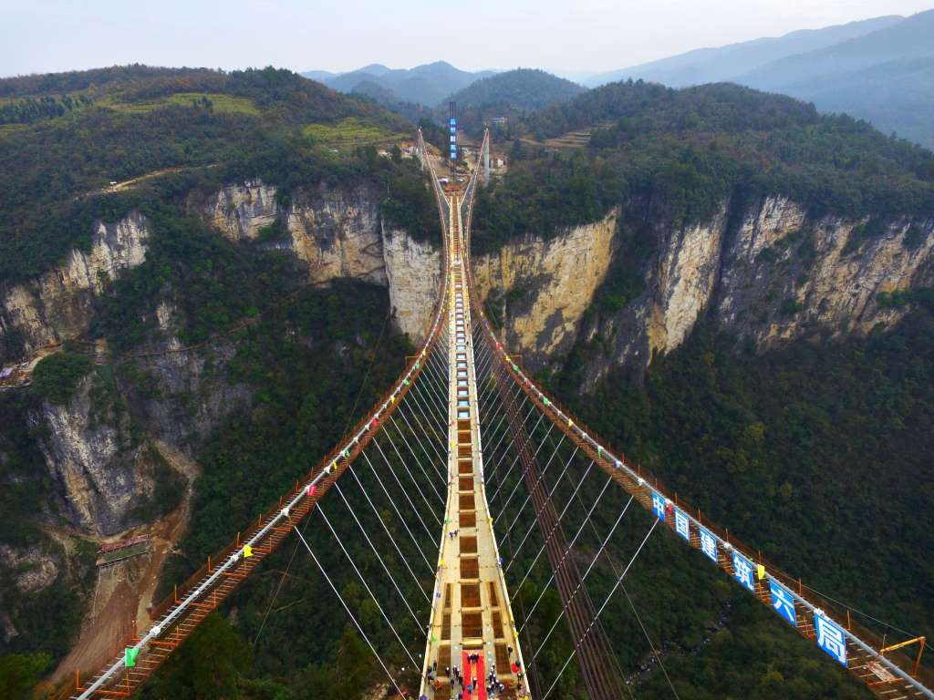 طولانی ترین و بلندترین پل با کف شیشه ای در جهان که در بالای یک دره عمیق به طول 375 و ارتفاع 300 متر ساخته شده است. برای جلوگیری از لرزش بر روی پل، توپ های شیشه ای غول پیکری را بر کف آن متصل کرده اند.
