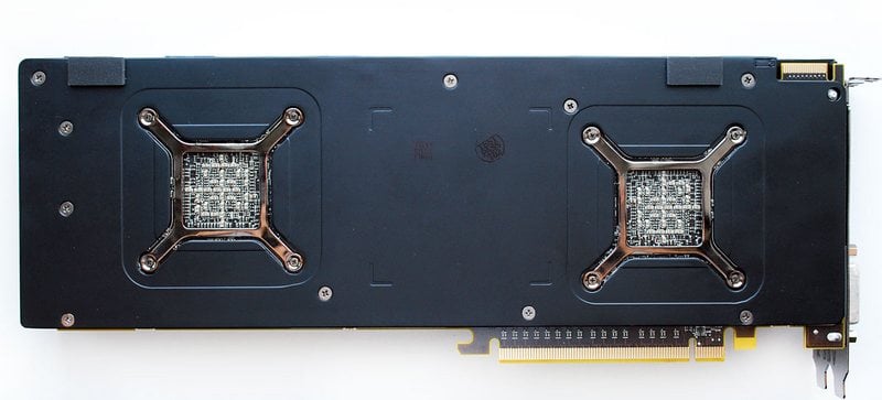 – برخلاف GTX 590، یک صفحه فلزی پشت کارتگرافیک را کاملاً پوشانده و فقط محل قرارگیری پردازندههای گرافیکی با هوا در تماس هستند.