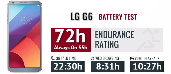 همانطور که در تصویر مشاهده می کنید باتری گوشی ال جی جی 6 امتیاز کلی 72 ساعت را کسب کرده است . البته این میزان در صورت فعال بودن ویژگی always on display به 55 ساعت کاهش می یابد . شایان ذکر است که فعال بودن always on display با وجود قرار گرفتن این ویژگی به صورت پیش فرض در گوشی و ساختار بهینه آن تاثیر قابل توجه ای بر روی عملکرد شارژدهی گوشی می گذارد .