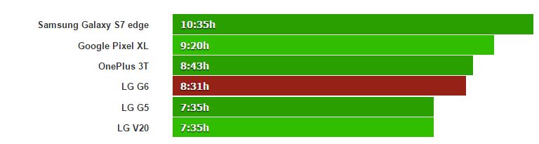 در بخش وب گردی با وای فای نیز جی 6 با 8:31 ساعت موفق شد یک ساعت بیشتر از جی 5 و وی 20 دوام داشته باشد . اگرچه این پیشرفت خوبی برای ال جی به حساب می آید اما هنوز در مقایسه با گوشی های سایر برند ها چندان شگفت انگیز نیست . گوشی Pixel XL در این زمینه می تواند یک ساعت بیشتر از جی 6 به مرور صفحات وب بپردازد و طول عمر باتری گلکسی اس 7 نیز 10:35 است. گوشی OnePlus 3T تنها پرچمداری است که نزدیک ترین عملکرد را به جی 6 داشته است .