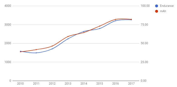 همانطور که در نمودار پایین قابل مشاهده است، در سال 2017 در مقایسه با سال های قبل، هم ظرفیت باتری ها و هم میزان پایداری آنها افزایش یافته است.