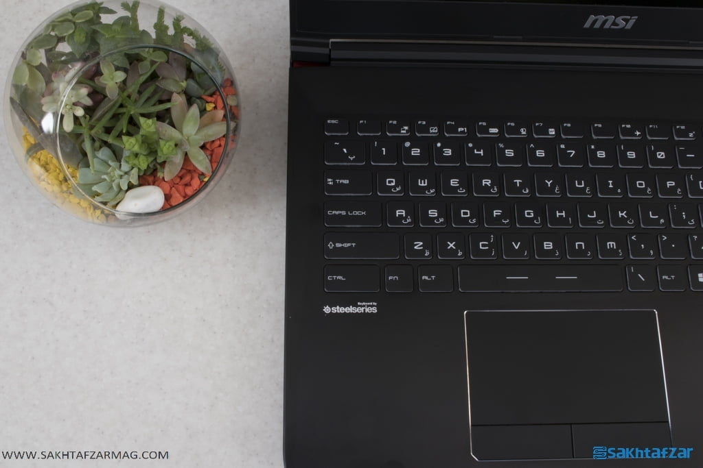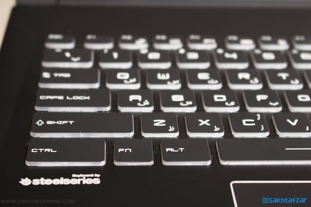 صفحه کلید ساخت SteelSeries ظاهر خوبی به این لپ تاپ داده است. کلید های ارگونومیک Tactile به همراه قابلیت Anti-Ghosting با تشخیص فشرده شدن 45 کلید همزمان از دیگر امکانات این صفحه کلید است. نور پس زمینه تمام سفید آن تشخیص کلیدها را در شب راحت تر کرده است. کلیدها بسیار نرم و برای استفاده بلند مدت مقاوم به نظر می رسند.