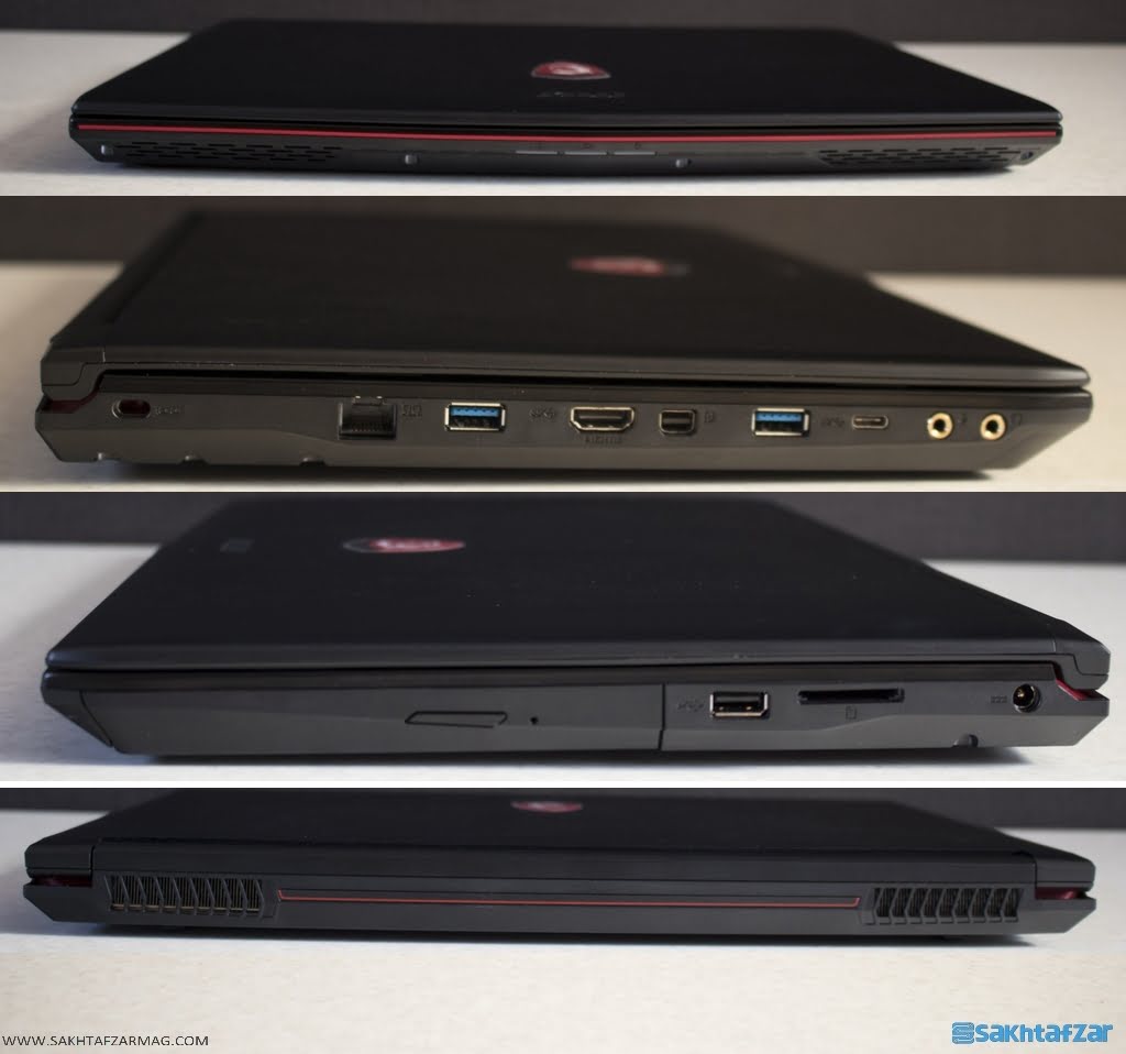 طول، عرض و ارتفاع این محصول به ترتیب برابر 38.3 در 26 در 2.9 سانتیمتر است و وزن آن 2.4 کیلوگرم است که به عنوان لپ تاپ گیمینگ قابل پذیرش است. در پشت لپ تاپ آرم زیبای MSI به همراه نشان G Series خودنمایی می کند. بدنه بیرونی لپ تاپ از پلاستیک با کیفیت مات ساخته شده است که بسیار مستعد لکه است. جای انگشتان دست به راحتی روی آن می ماند ولی به نظر نسبت به خط و خش مقاوم است.
