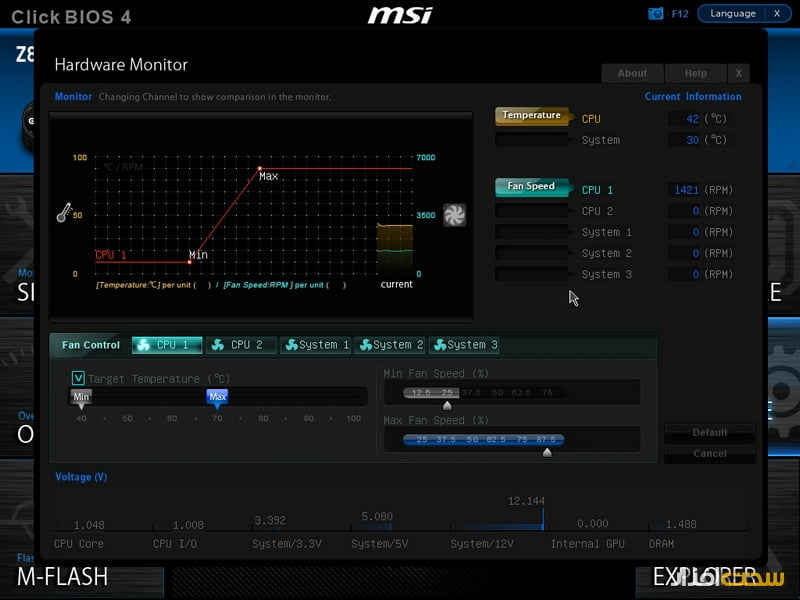 خروجی صدا نیز توسط چیپست Realtek ALC892 صورت میگیرد و نرمافزار SoundBlaster نیز برای مدیریت صدا در نظر گرفته شده است. پنج اتصال فن برای چنین محصولی کاملاً مناسب بوده و در ضمن گزینه OC Genie نیز همچنان در دسترس است (البته دکمه فیزیکی از روی مادربورد حذف شده و از طریق بایوس باید این ویژگی را فعال کرد). نکته مثبت دیگر درباره این مادربورد، استفاده از یک هیتسینک بزرگ برای چیپست است که باعث میشود این قطعه همان گرمای ناچیز خود را نیز بتواند به خوبی دفع نماید. کسانی که همچنان از کارتهای جانبی قدیمی PCI استفاده میکنند میتوانند خوشحال باشند، زیرا سه رابط PCI در این مادربورد وجود دارد که میتواند میزبان خوبی برای کارتهای قدیمی شما باشد. بایوس مادربورد (که در زمان تست به نسخه 1.3 ارتقا یافت) طراحی مشابه قبل دارد و گزینههای خوبی را در اختیار کاربر قرار میدهد. همچنان دو ستون اصلی از تنظیمات در دو سمت صفحه قرار دارد و یکی از گزینههای خوب آن بخش Hardware Monitor است که امکان تنظیم دما و سرعت فن را به شکلی مناسب فراهم میکند (تصویر 2).
