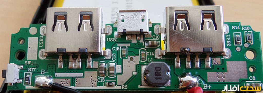 تنها برد درون این شارژر همراه از جنس فایبرگلاس با فناوری ایجاد مدار در دو رو با چاپ رنگ سبز است که در آن از اتصالات و قطعات الکترونیکی با کیفیت در دو سمت برد استفاده شده که از حیث کیفیت ساخت کاملا قابل‌قبول است. برای بالا بردن توان خروجی‌ها و به حداقل رساندن نویز و پارازیت، مدارهای قطب منفی در تمام سطوح برد مدار چاپی گسترده شده که نکته مهم و ظریفی در طراحی بردهای منبع تغذیه به شمار می‌آید. همچنین نکته بسیار مثبتی که در برد مدار چاپی نگاه ما را مجذوب خود کرد استفاده از سو‌کت‌های USB خاصی بود که شرکت ADATA آنها را در میان برد مدار چاپی باظرافت، مهارت و وسواسی خاص قرار داده به‌طوری که هم از ضخامت نهایی محصول کاسته و هم به استحکام این سو‌کت‌ها روی برد به‌شدت افزوده است. این دو سوکت USB که درگاه‌های خروجی شارژر هستند در میان فضای تراشیده شده در لبه برد با چهار عدد پایه که مانند لنگر در برد فرو رفته‌اند سفت و محکم در جای خود متصل شده‌اند و تضمین‌کننده اتصالی بادوام در ابعادی کوچک هستند. البته این روش اتصال سوکت‌های USB به برد مدار چاپی توسط شرکت‌های دیگر هم استفاده می‌شود و به نوعی استاندارد در این روش تولید محسوب می‌شود، این نوع اتصالات روزبه‌روز در حال تغییر و پیشرفت هستند. اتصال سوکت microUSB هم بسیار خوب و با دقت انجام شده و هر چهار پایه آن درون برد محکم لحیم‌کاری شده‌اند و جای نگرانی از بابت دوام و استحکام آن باقی نمی‌گذارد (تصویر 5).