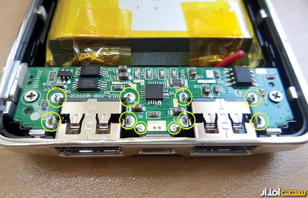 با اینکه مدار شارژرهای همراه از نوع مدارهای ساده است، اما قرار دادن دو خروجی مختلف و هوشمند در ابعادی کوچک کار نسبتا سختی است. ADATA برای رسیدن به این هدف در کل از پنج تراشه استفاده کرده که دوتای آنها تراشه FS8205A از شرکت TY Semiconductor هستند که درون هر کدام از آنها دو عدد ترانزیستور ماسفت (MOSFET Transistor) پرقدرت قرار دارد و با تراشه کوچک سری LTC از شرکت Linear (که پیشرو در تولید تراشه‌های منابع تغذیه است) در ارتباط هستند. قطعات الکترونیکی تولید این شرکت را امروزه تقریبا در هر وسیله‌ای که به نوعی خروجی ولتاژ دارد، می‌توان یافت این شرکت با تراشه‌های خود سبب نوآوری‌های بسیاری درزمینه انواع شارژرها و منابع نیروی الکتریسیته شده است. دو تراشه بعدی که یکی از آنها هم تولید شرکت MicrOne است وظیفه کنترل اصلی و نمایش مراحل اصلی شارژ خروجی و ورودی را بر عهده دارند (تصویر 6).