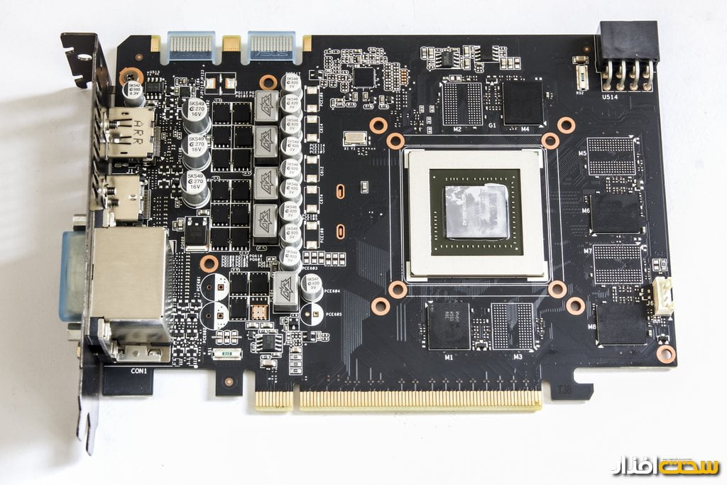 فن جدید دارای دو سری پره است و به طراحی خص خود میتوانند به خوبی گرما را از داخل کارت گرافیک خارج نمایند. دورتادور فن صفحات فلزی قرار گرفته است و در زیر فن نیز، یک Vapor Chamber کوچک (مشابه آنچه در کارت های گرافیک GTX 580 یا کارت های گرافیک سری HD 6900 کمپانی AMD دیده بودیم) قرار دارد تا بتواند به سرعت گرما را از پردازنده گرافیکی با سطح بالا منتقل نماید. در سمت چپ خنک کننده، هیت سینک دیگری متصل به کل سیستم خنک کننده قرار گرفته تا بتواند بخشی از گرمای مربوط به اجزای مدار رگولاتور را دور نماید.با باز کردن کارت گرافیک مشاهده میکنیم که یک مدار رگولاتور پنج فاز برای تامین برق پردازنده گرافیکی و ماژول های حافظه در نظر گرفته شده است (تصویر 2).