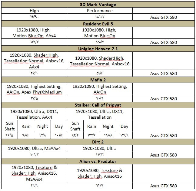 ظاهر کارتگرافیک کاملاً مشابه نمونه استاندارد معرفیشده NVIDIA است. اما فرکانس پردازندهگرافیکی آن 10 مگاهرتز افزایش پیدا کردهاست که روی کارایی نهایی در تستها تأثیر بسیار اندکی دارد. جدول نتایج تست این کارتگرافیک را در سیستمی مشابه سیستم تست کارتگرافیک Gigabyte GTX 580 نشان میدهد. اشاره به اين نکته داراي اهميت است که هدف ما از نوشتن اين مقاله نشان دادن تأثير تغيير فرکانس پردازندهگرافيکي بر کارايي کارتگرافيک است، پس نخست تستها را بدون تغيير فرکانس کارتگرافيک (در فرکانس خود کارتگرافيک Asus) انجام داديم و بعد با استفاده از قابليت خاص Asus، کارتگرافيک را اورکلاک و تست 3Dmark Vantage را دوباره انجام داديم تا بتوانيم بهتر با تأثير اورکلاکينگ در اين کارتگرافيک آشنا شويم.