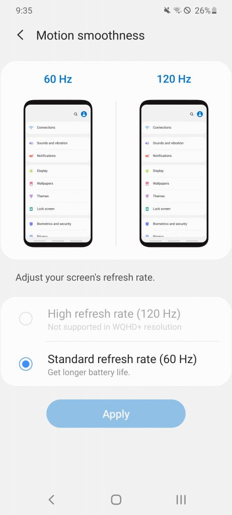 مانند دو برادر بزرگتر خود، نمایشگر گلکسی S20 هم برای استفاده در حالت 120 هرتز با محدودیت همراه است و امکان فعال کردن آن در بالاترین سطح روزلوشن (3200×1440) وجود ندارد. البته گفته شده که سامسونگ قصد دارد این محدودیت را در آپدیتهای آینده خود بردارد، اما تا زمان نگارش این بررسی، این موضوع به قوت خود باقی است. در هر حال، رزولوشن FHD+ این نمایشگر هم از کیفیت بسیار بالایی برخوردار است و هیچ ایراد خاصی به آن وارد نیست.