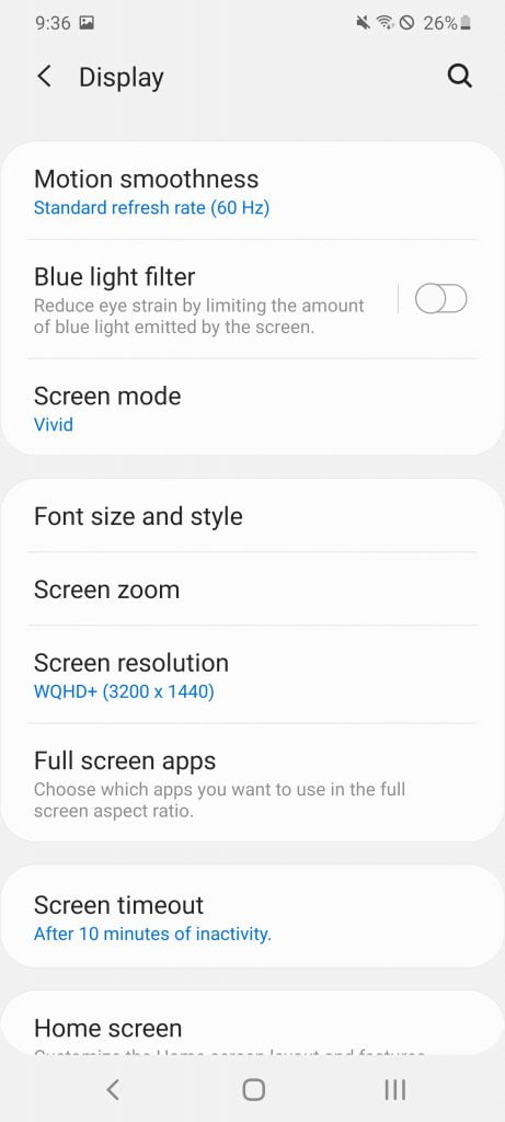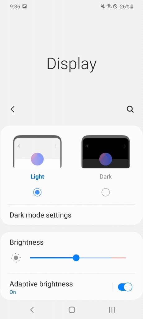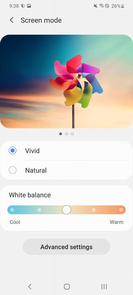در منوی تنظیمات نمایشگر، بالاتر از تمام گزینهها، بخش انتخاب تم روشن (Light) یا تاریک (Dark) قرار گرفته است. بخش دیگر این منو، Screen Mode است که مانند همیشه دارای دو گزینه Natural و Vividبرای تنظیم حالت نمایشگر است. در حالت Vivid امکان تغییر میزان رنگهای RGB و سردی و گرمی تصویر نیز وجود دارد.