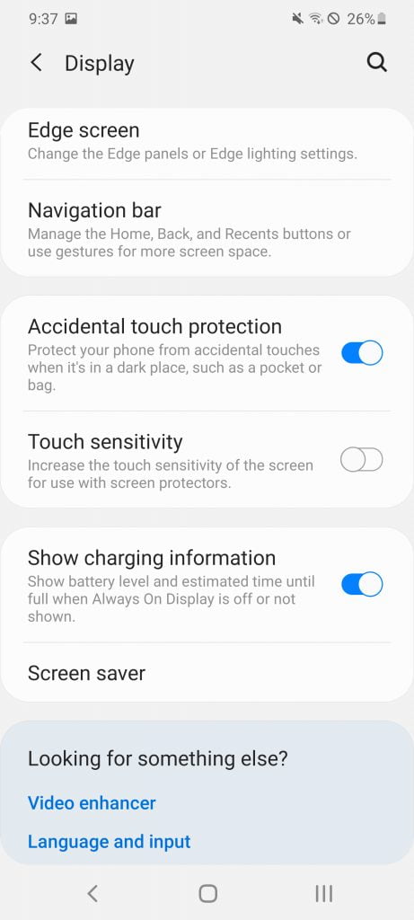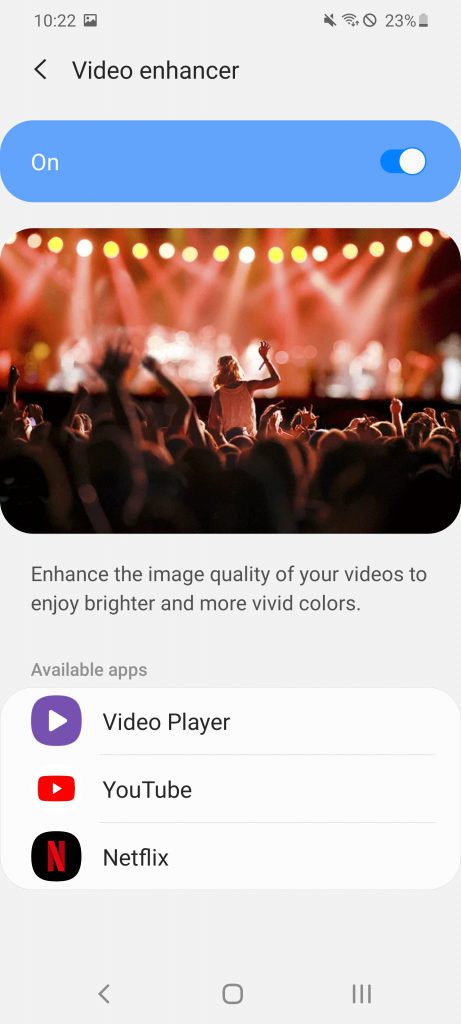 Video Enhancer یکی دیگر از تنظیمات گوشی گلکسی S20 است که با بالابردن کیفیت تصاویر ویدئوها، به لطف HDR و قابلیت Dolby Vision، آنها را روشنتر و رنگهای زندهتر به چشمان کاربران ارائه میکند. این قابلیت در حال حاضر، برای 3 برنامه Video Player، یوتیوب و نتفلیکس در دسترس است. تنظیمات دیگری که در بخش نمایشگر این گوشی وجود دارد، مانند Blue Light Filter (فیلتر نور آبی) یا Edge Screen و Navigation Bar، مواردی هستند که بهطور معمول در تمامی گوشیهای سامسونگ آنها را دیدهایم.