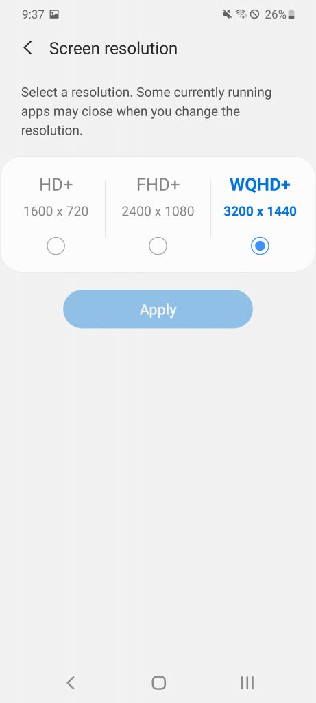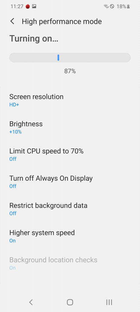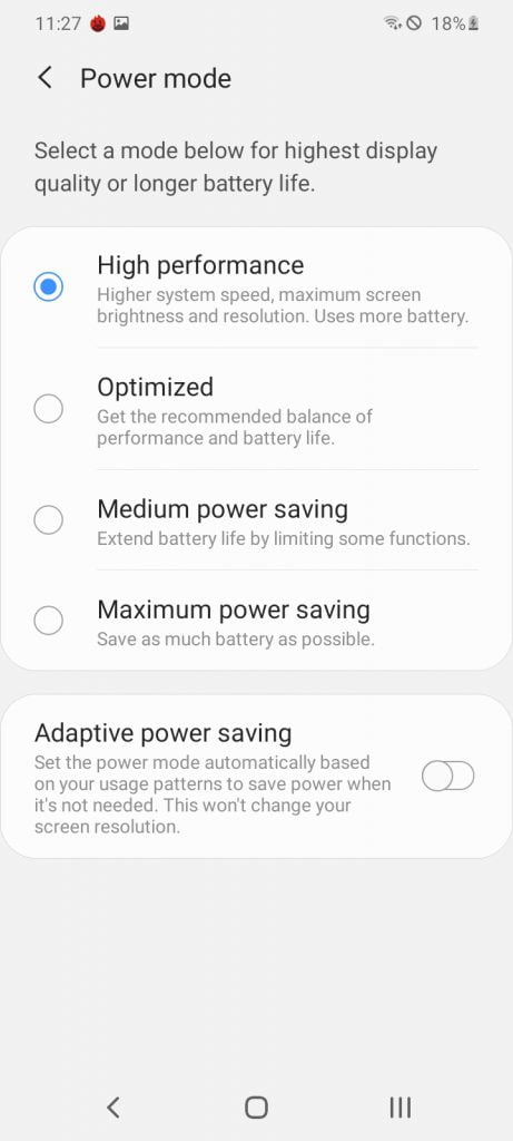 در صورتیکه هم که قصد داشته باشید برای اهدافی مانند بازی یا تماشای فیلم، از تمام قدرت گوشی استفاده کنید، میتوانید گزینه High Performance را انتخاب کرده که در این صورت میزان مصرف باتری بالاتر خواهد رفت. گزینه دیگری که در این بخش در نظر گرفته شده، Adaptive Power Saving است که براساس استفاده کاربر از گوشی، الگوهای بهینه مصرف انرژی را اجرا میکند. البته در با فعال کردن این گزینه، تغییری در رزولوشن نمایشگر ایجاد نخواهد شد.