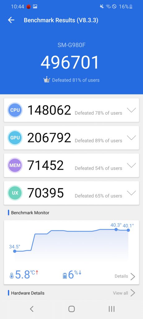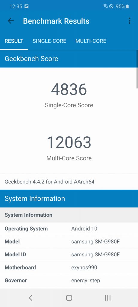 عملکرد سختافزاری گلکسی S20 در تستهای بنچمارک رضایت بخش بوده و نکته جالب و کمی عجیب ماجرا اینست که این گوشی تقریباً در تمامی بنچمارکها، در شرایط یکسان امتیازات بهتری از برادر بزرگتر خود، S20+ کسب کرده است.