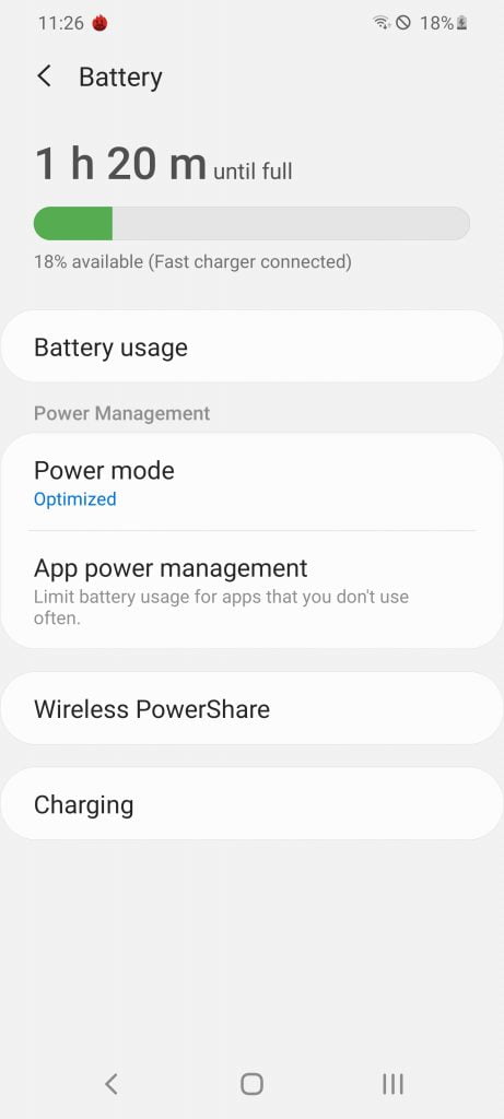 در بخش تنظیمات باتری، 4 حالت مدیریت مصرف انرژی در نظر گرفته شده است. High Performance (بالاترین سطح عملکرد)، Optimized (بهینه)، Medium-power saving (سطح میانی ذخیره انرژی) و Maximum power saving (بالاترین سطح ذخیره انرژی). باتری گوشی بهطور پیشفرض در حالت بهینه قرار دارد، اما زمانیکه نیاز به مدیریت مصرف باتری است و امکان شارژ گوشی وجود ندارد، دو حالت آخر میتوانند مفید واقع شوند.