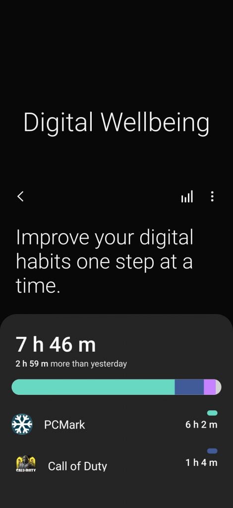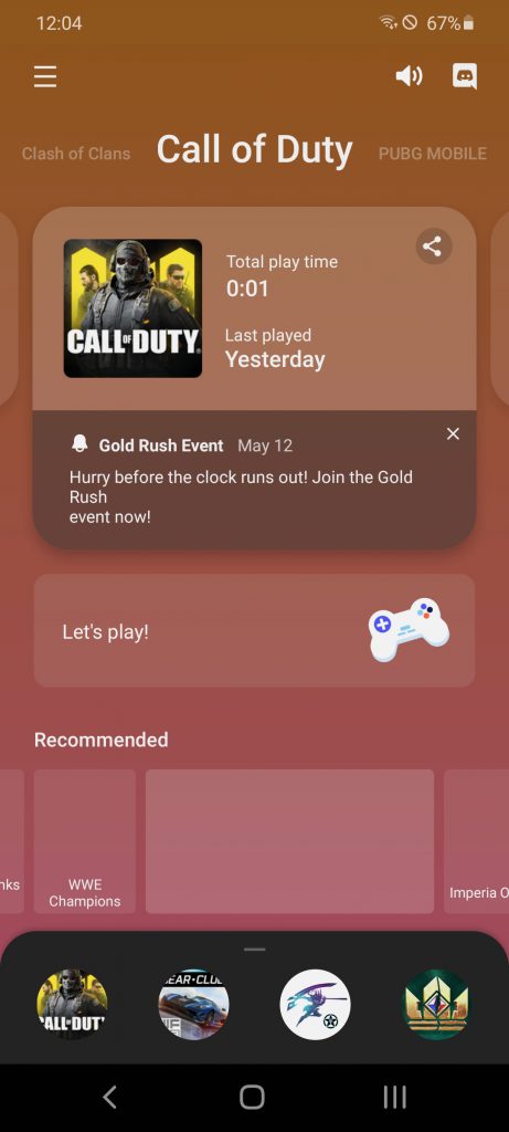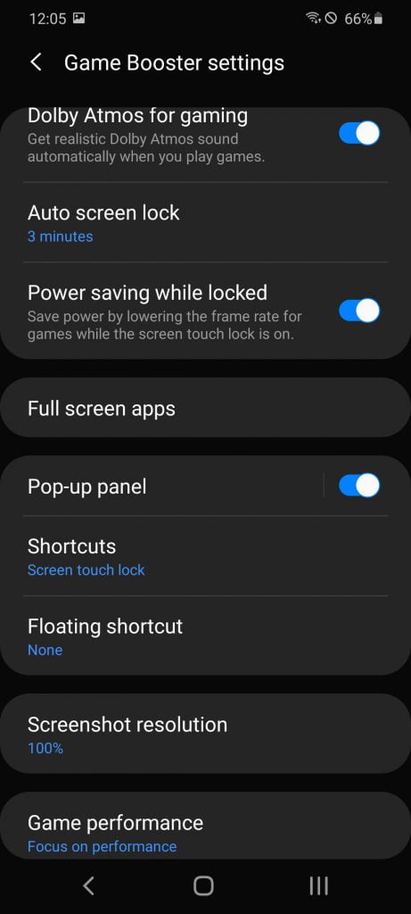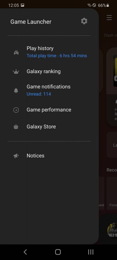 محیط منوی Game Launcher نیز کاملاً گیمینگ است و در کنار بازیهای نصب شده به کاربر بازیهای دیگر را نیز پیشنهاد میدهد. در تنظیمات این بخش اطلاعاتی مانند مدت زمان بازی با گوشی و تعداد اعلانات بازیها ارائه میشود. همچنین امکان این وجود دارد که تعیین شود تمرکز دستگاه بر روی چه گزینهای باشد؛ مصرف باتری، عملکرد بهتر در اجرای بازی و یا تعادل میان این دو گزینه.