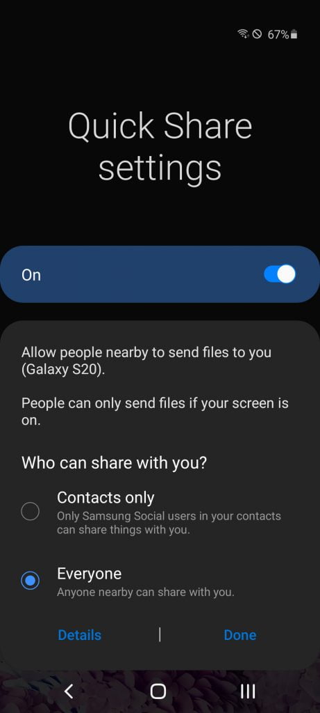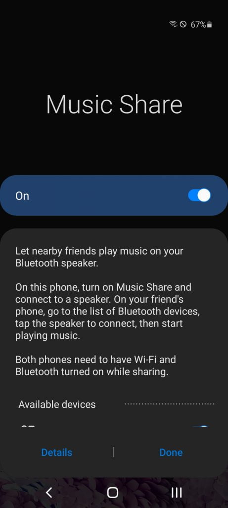 Quick Share قابلیت مفید دیگری است که از طریق اتصالات بلوتوث و Wi-Fi Direct جابجایی فایلها بین گوشی و دستگاههای دیگر را فراهم میکند. Music Share هم از طریق بلوتوث میتواند گوشی را به اسپیکر بلوتوثی متصل کرده تا به عنوان یک هاب عمل کند تا دستگاههای دیگر بتوانند از طریق این گوشی به اسپیکر متصل شوند.