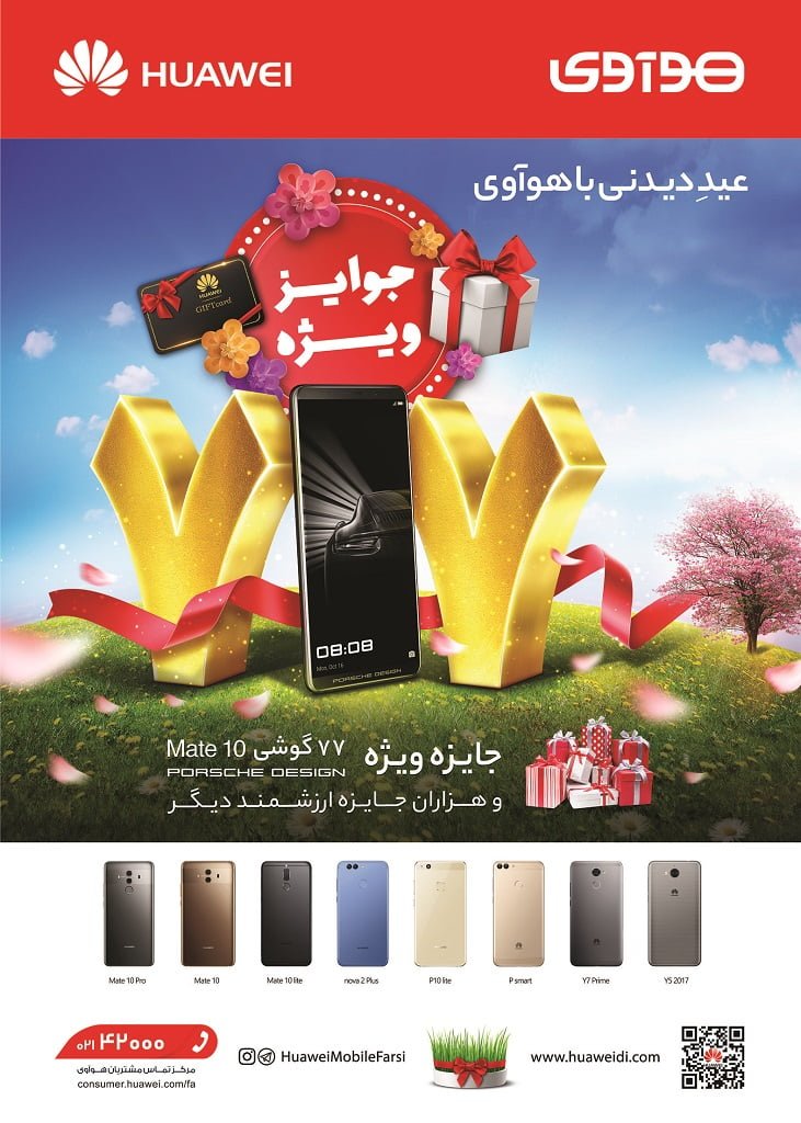 را خریداری کنند، علاوه بر بهره مندی از کیفیت و امکانات بالای گوشی های فوق الذکر در کنار قیمت مناسب آنها، از هزاران جایزه ارزشمند نیز بدون هیچ گونه قرعه کشی بهره مند خواهند شد با خرید هر گوشی، یک هدیه از طرف هواوی دریافت می کنند.علاوه بر هزاران جایزه ای که برای کاربران بدون قرعه کشی در نظر گرفته شده، هواوی 77 گوشی ارزشمند PORSCHE DESIGN Mate 10 را به همراه برخی جوایز ارزشمند دیگر مانند اسپیکرهای با کیفیت JBL را نیز برای قرعه کشی های هفتگی در نظر گرفته است. به این ترتیب کاربران از 12 بهمن ماه تا پایان تعطیلات نوروز به ازای خرید هر گوشی، علاوه بر دریافت هدیه بدون قرعه کشی، فرصت حضور در قرعه کشی هفتگی هوآوی برای جوایز ارزشمندی مانند 77 گوشی PORSCHE DESIGN Mate 10 ، اسپیکر های JBL و . . . را خواهند یافت. برای اطلاع از نحوه دریافت جوایز و شرکت در قرعه کشی هفتگی هوآوی و همچنین برای کسب اطلاعات بیشتر در خصوص برنامه های هوآوی در رویداد “عیدِ دیدنی با هواوی” می توانید به وب سایت این رویداد به نشانی www.huaweidi.com مراجعه کنید.