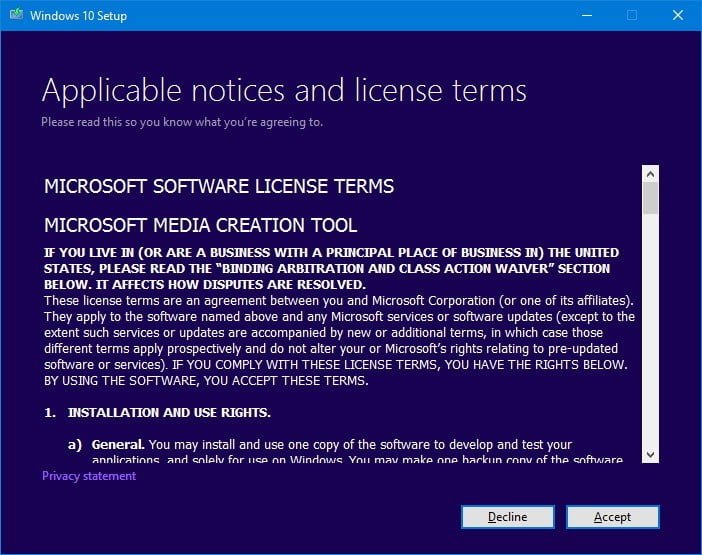 یکی دیگر از ابزارهای مایکروسافت برای نصب ویندوز 10 که پیشنهاد میشود Media Creation Tool نام دارد و امکان نصب ویندوز به صورت Clean نیز وجود دارد که مطمئنا بهترین روش نصب ویندوز است. از طریق این برنامه نیز شما میتوانید نسخه ی جدید ویندوز 10 را چند روزی زودتر از عرضه ی عمومی دریافت کنید. برای استفاده از این برنامه به صورت زیر عمل کنید: