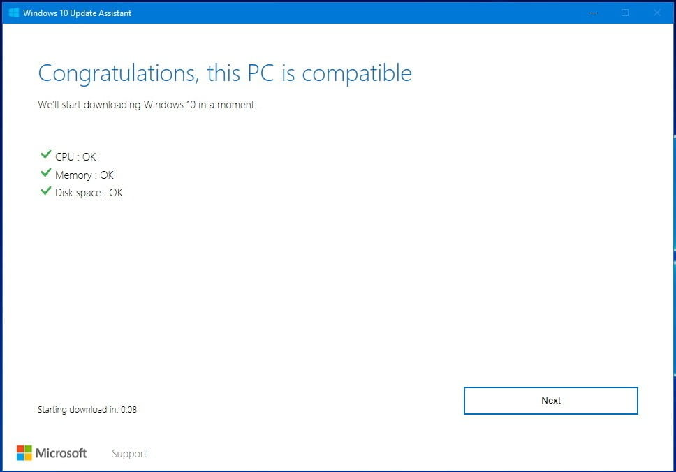 - در صورتی که سازگاری سیستم شما با ویندوز 10 تائید شد، گزینه ی Next را برای آغاز بروزرسانی بزنید.