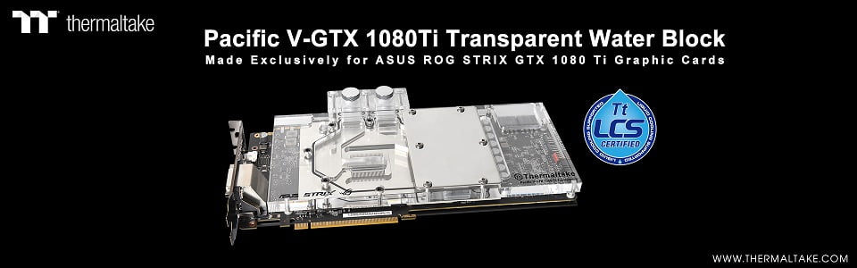 شرکت تایوانی Thermaltake سازنده انواع تجهیزات جانبی کامپیوتر، اورکلاک، مودهای دسکتاپ و … است. این شرکت به تازگی و با همکاری شرکت ASUS، یک بلوک خنک کننده مایع را معرفی کرده است که بر روی کارت گرافیک جدید این شرکت نصب می گردد. این بلوک تحت عنوان Thermaltake Pacific V-GTX 1080Ti Transparent به تازگی راهی بازار شده است و بر روی کارت گرافیک ASUS ROG STRIX GTX 1080 Ti سوار می شود. در ساخت این بلوک از فناوری CNC استفاده شده است که یک صفحه به ضخامت 4 میلی متر نیز بر روی آن نصب شده است.