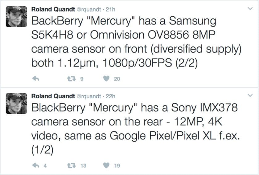 این اطلاعات توسط یکی از فاش کنندگان معتبر با نام Roland Quandt منتشر شده است و این شخص ادعا میکند که Mercury در بخش دوربین اصلی به سنسور 12 مگاپیکسلی IMX378 سونی که از ضبط ویدئو با کیفیت 4K نیز پشتیبانی میکند مجهز خواهد بود. این دقیقا همان سنسوری است که گوگل در پیکسل های خود استفاده کرد و توانست بیشترین امتیاز را از DXOMark دریافت کند. در بخش جلوی این گوشی نیز سنسور 8 مگاپیکسلی سامسونگ S5K4H8 یا سنسور Omnivision OV8856 با رزولوشن مشابه و اندازه ی پیکسل 1.12 میکرون و قابلیت پشتیبانی از ضبط ویدئوی فول اچ دی با 30 فریم بر ثانیه استفاده خواهد شد. همچنین Roland Quandt در گزارش خود شایعه ای که ایوان بلس 6 ماه پیش مبنی بر مجهز بودن Mercury به اسنپدراگون 625 منتشر کرده بود را نیز تائید کرده است. بنابراین بر خلاف دوربین Mercury که احتمالا کیفیت بسیار بالایی همانند پرچمداران خواهد داشت، از نظر قدرت پردازشی در ردیف گوشی های میان رده قرار خواهد گرفت.